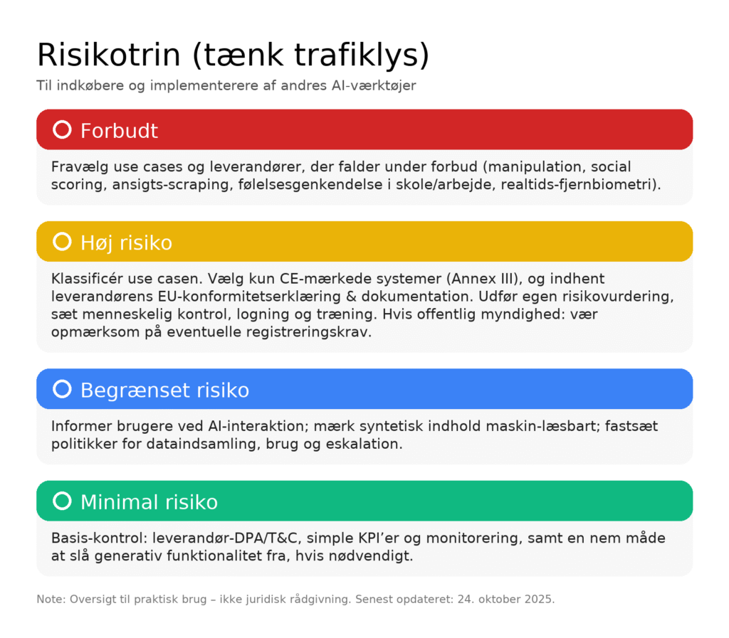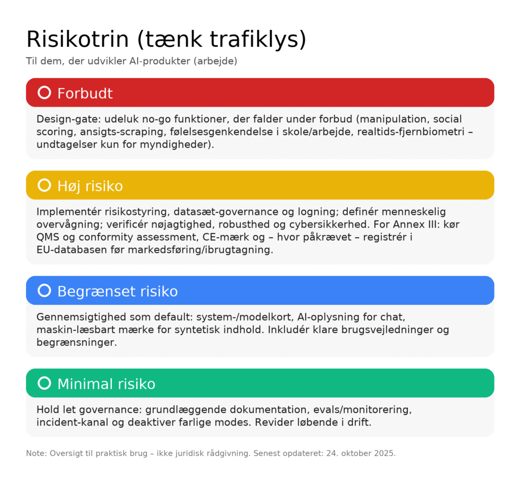 * Minimal risiko: de fleste andre anvendelser — ingen ekstra AI Act-krav.